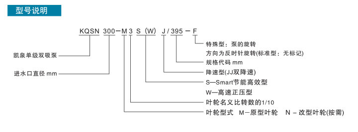 KQSN系列共有107種型號、508個規格參數的產品,能提供不同葉輪直徑、不同轉速的多種性能工況選擇(詳見型譜)。